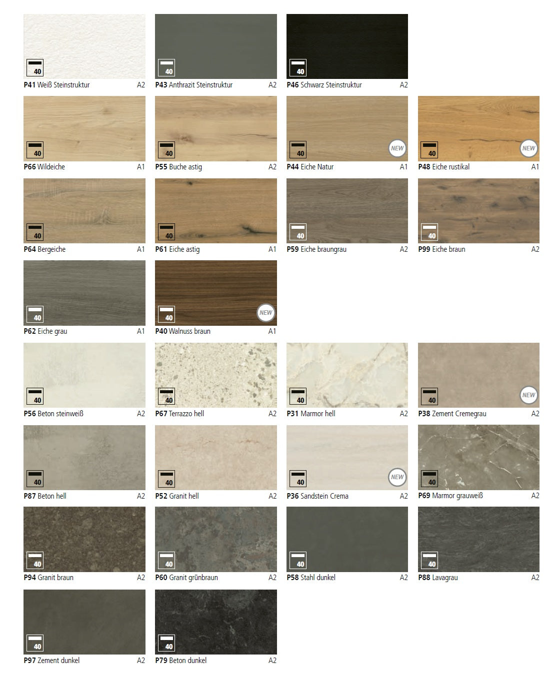 Hinweis: Anstelle der Dekore P41, P43 und P46 werden Uni-Farbdekore geliefert!